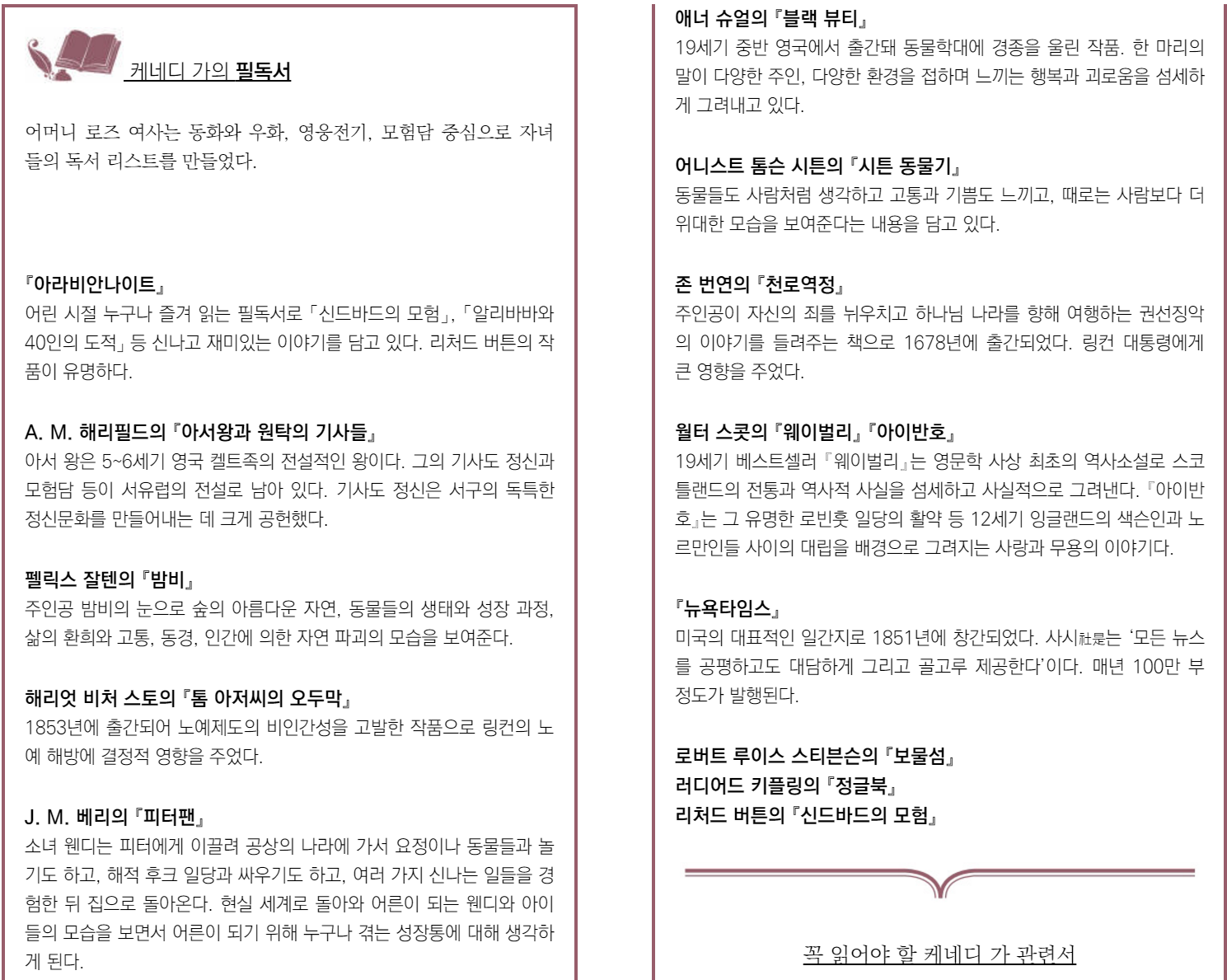 케네디 대통령의 아버지인 조셉 패트릭 케네디는 하버드를 졸업하고 은행장이 되었고, 이어 조선소 부사장, 증권 중개인을 거쳐 영화산업, 주류업과 부동산으로 벼락부자가 되었다. 케네디는 스무살에 이런 아버지 재력의 뒷받침으로 '그랜드 투어'라는 유럽상류층 자제들의 서유럽 주요 명소를 여행하고 식견을 갖추는 견문 유람여행을 갈수 있었다. 이 여행동안 외교문제에 관심이 커졌고, 국제 정세에 대한 견문을 넓힐 수 있었다. 또한 하버드에서 공부에 매진하는 계기도 만들어줬다. 정치학과 국제 정세에 관심이 쏠려 있던 케네디는 23세에 대통령을 꿈꿨고 44살에 그 꿈을 이뤘다. 케네디 가는 아버지와 어머니가 조화롭게 역할을 다한 집안이다. 아버지는 자녀들에게 "일등을 해라. 이등은 필요 없다"고 강조했고, 로즈 여사는 부담이 될 아이들에게 "처음에는 서툴러도 열심히 반복하다보면 나중에는 최고가 될 수 있다"며 자신감을 북돋워주었다. 로즈 여사는 9남매의 교육에 열정적이었다. 여러 육아서를 읽고 참고했으며, '귀한 자식일수록 엄하게 키워라'의 지침대로 아이들을 키웠다. 이에 케네디 형제들은 어머니의 독서교육과 문법교육에 힘입어 경쟁적으로 책을 내기도 했다. 많은 정치인을 배출한 케네디가는 한사람 한 사람 모두 큰 영향력을 발휘했다. 그 시작은 어머니 로즈 여사의 육아일기와 독서 리스트에서 시작됬다고 해도 과언이 아닐 것이다.