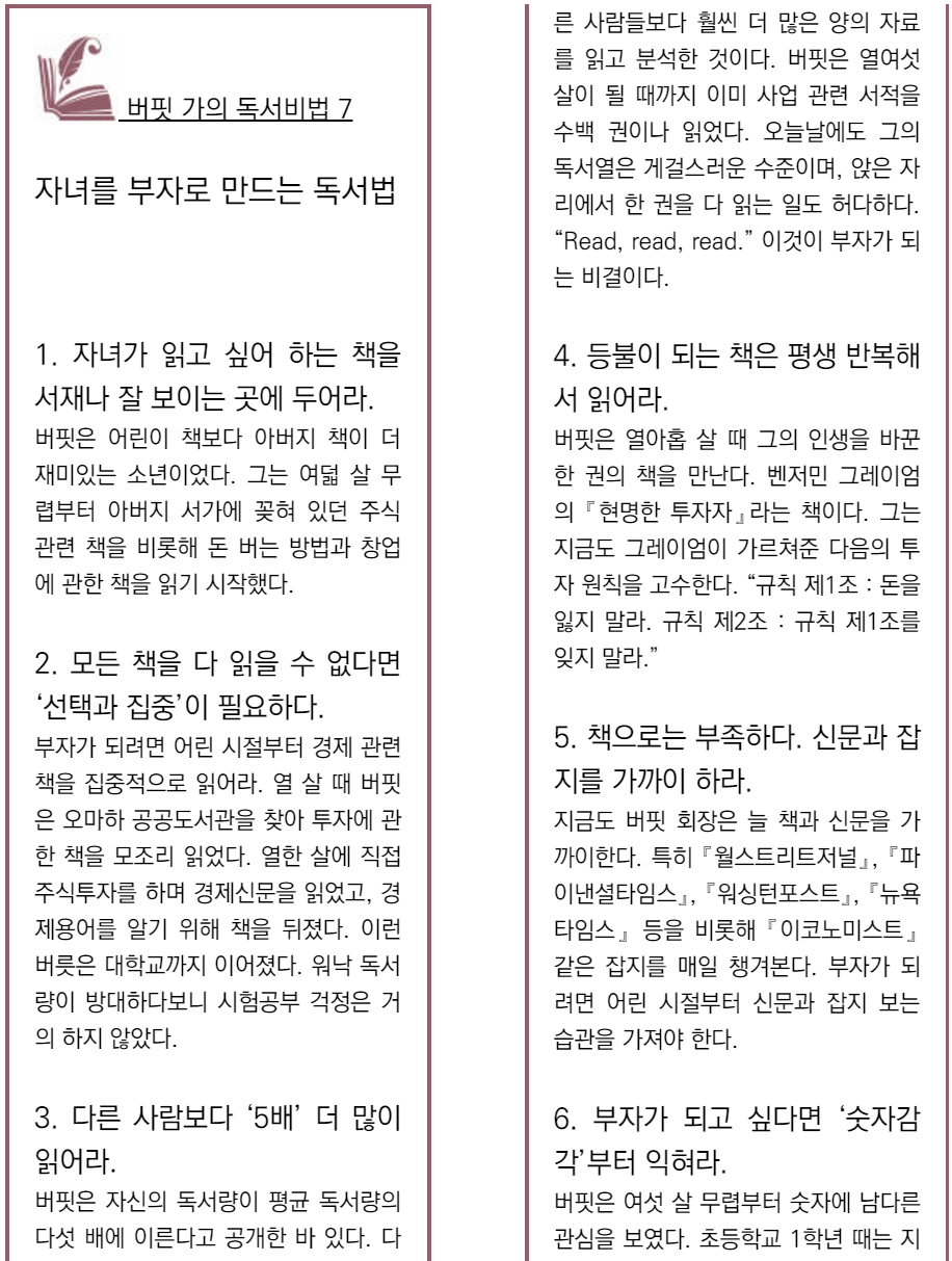 워렌 버핏의 투자 인생에서 큰 영향을 준 인물로 벤저민 그레이엄을 꼽을 수 있습니다. 열아홉 살의 버핏은 그레이엄의 '현명한 투자자'를 읽고, 책으로 만난 위대한 스승을 실제로 만나 배우기 위해 교수로 있던 컬럼비아대학교 경영대학원에 들어갔습니다. 학기 중 그레이엄으로부터 A+ 학점을 받았는데, 이는 그레이엄이 22년 동안의 교수 기간 동안 처음이자 마지막이었다고 합니다. 버핏은 스승인 그레이엄이 독립해 차린 투자회사에서 일하는 행운도 얻었습니다. "당신의 영웅이 누구인지 말해주면 당신이 어떤 인간이 될지 말해주겠다" 버핏이 대학생들과 대화, 토론을 할 때 자주 하는 말입니다. 좋은 스승, 좋은 습관 그리고 올바른 가치관과 원칙이 있다면 누구든 성공할 수 있다고 강조합니다. 무엇보다 날마다 꾸준히 읽고, 배우고, 귀담아듣고, 우선순위를 정하는 습관을 가지라고 말합니다. 친구를 고를 때도 성적, 외모보다 좋은 습관과 올바른 가치관을 가진 친구를 사귀라고 합니다. 버핏은 지금도 하루의 3분의 1을 각종 교양서적과 투자 관련 자료, 신문과 잡지를 읽는데 할애하고 있습니다. "일간지를 읽으면 세계가 어떻게 돌아가는지 이해하는 데 도움이 됩니다. 어느 시점에 스포츠든 경제 뉴스든 관심 가는 분야가 생기기 마련이고, 더 많이 알수록 더 배우기를 원하게 될 것입니다."
